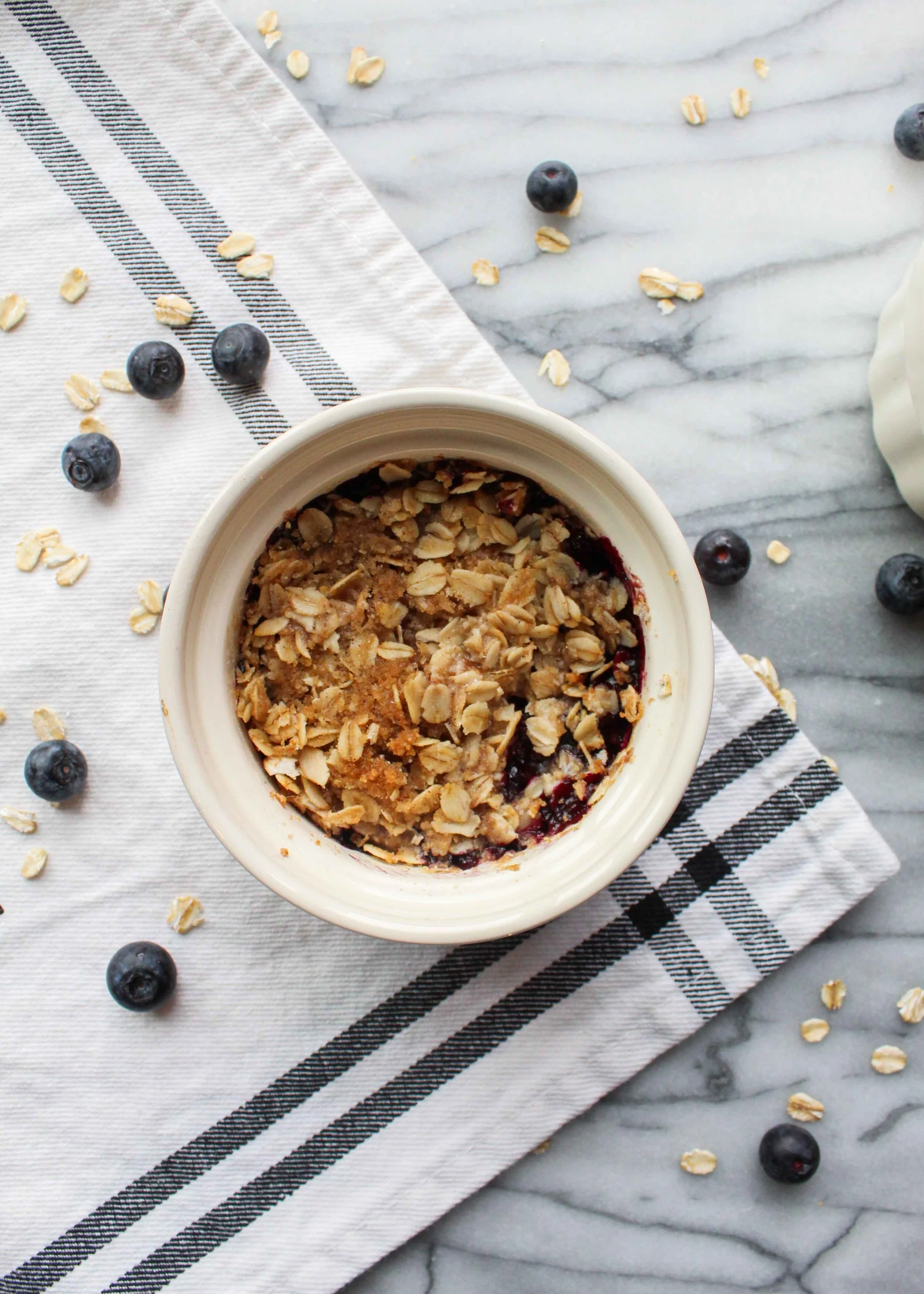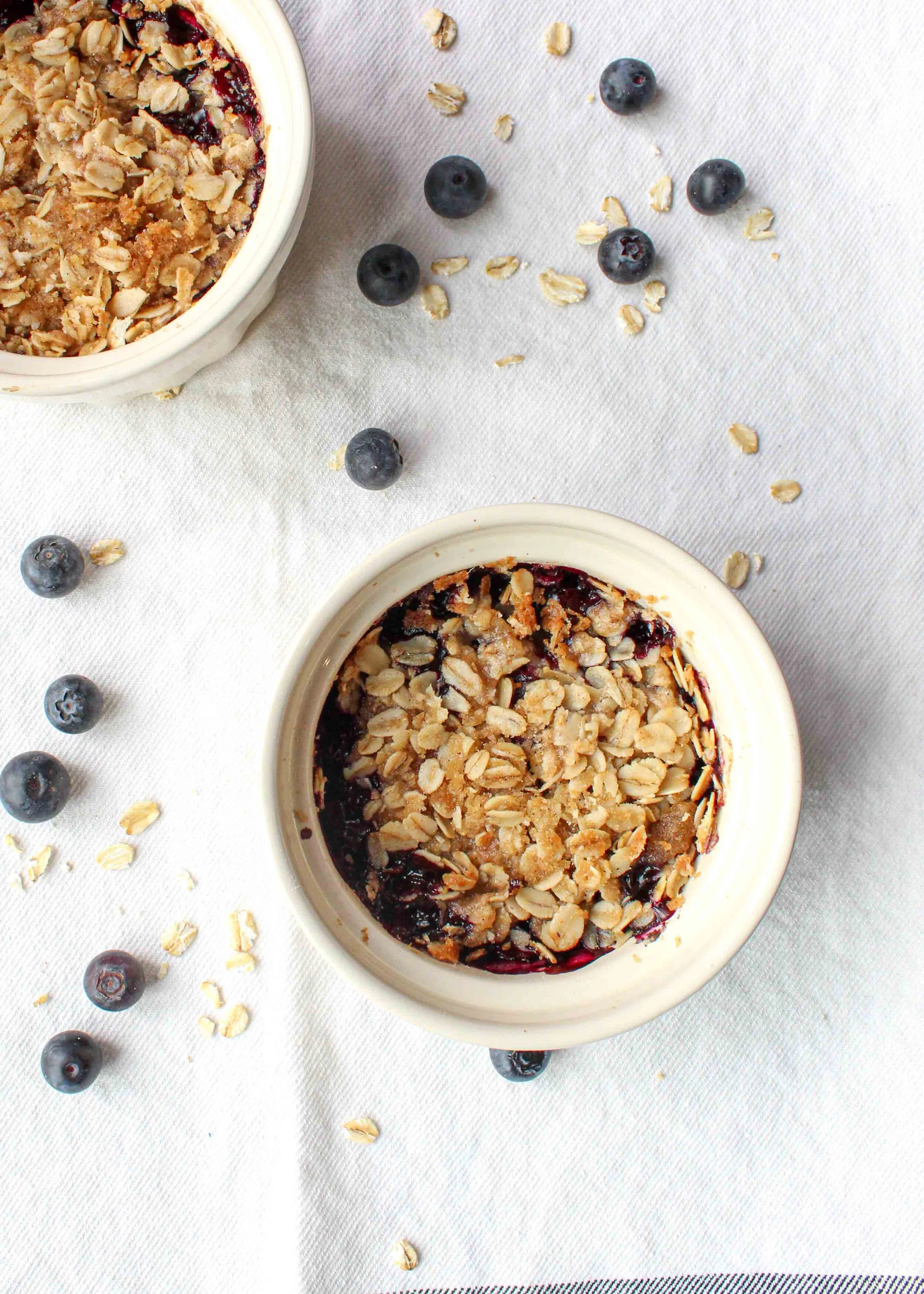 In a different small bow, use a fork to combine the butter, flour, brown sugar, cinnamon, and oats. Spoon the topping on top of the blueberry filling in the ramekins.